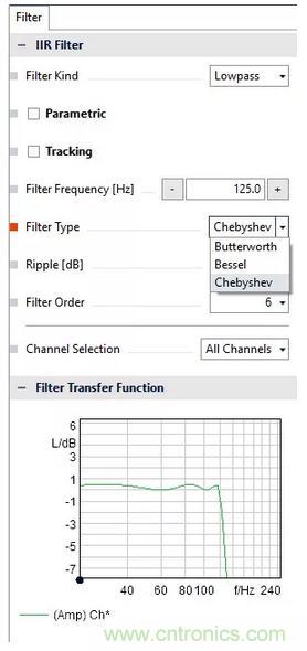 有三種IIR濾波器可供選擇,分別為切比雪夫I型、貝塞爾以及巴特沃斯濾波器。對(duì)于不同類(lèi)型的濾波器可自定義參數(shù)。比如對(duì)于巴特沃斯濾波器需要定義截止頻率和濾波器階數(shù),如果是帶通或者帶阻,還需要確定通帶/阻帶帶寬;如果是切比雪夫?yàn)V波器的話,還需要確定波動(dòng)值。