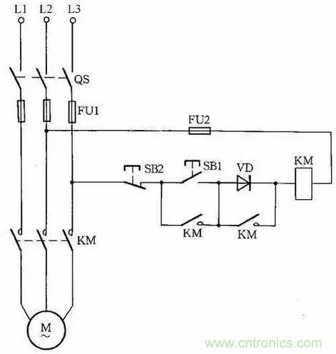 因為啟動電流較大,所以這種線路只適用于操作不頻繁的場合。線路中,VD應選用耐壓大于700V的二極管,電流要根據(jù)交流接觸器線圈電流而定。