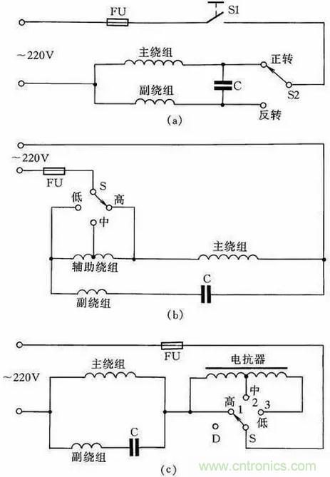 圖16(c)為帶電抗器調速的電容電動機接線線路。由于電抗器繞組(其在線路中起到降壓作用)的串入,調節(jié)電抗器繞組的串入量,即可改變轉速。這種方法目前廣泛應用在家用電風扇線路中。在啟動電動機時一般先撥到“1”擋上,即為高擋,這時電抗器不接入線路,使電動機在全壓下啟動,然后再撥“2”擋或任何擋來調節(jié)電動機轉速。