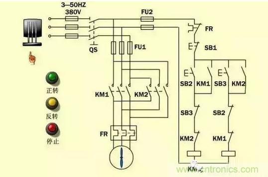 星三角我上圖分析過了,控制電機正反轉也分析過了。兩圖合一就是這個圖了,喜歡的朋友可以自己學著分析一下。
