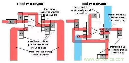 除了使用去耦電容器外,您還要在去耦電容器、電源和接地端之間采取較短的低阻抗連接。圖3將良好的去耦合板面布局與糟糕的布局進行了對比。您應始終嘗試著讓去耦合連接保持較短的距離,同時避免在去耦合路徑中出現(xiàn)通孔,原因是通孔會增加電感。大部分產(chǎn)品說明書都會給出去耦合電容器的推薦值。如果沒有給出,則可以使用0.1uF。