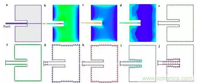 圖4:天線的聚類可視化結(jié)果。a,天線模型。b,表面電流密度分布。c,磁場分布。d,電場分布。e,Meshed模型。f-j,網(wǎng)格頂點(diǎn)聚類的可視化結(jié)果。