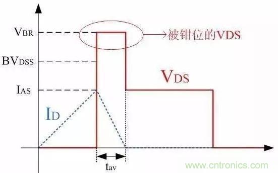 MOSFET雪崩時(shí),波形上一個(gè)顯著的特點(diǎn)是VDS電壓被鉗位,即上圖中VDS有一個(gè)明顯的平臺(tái)