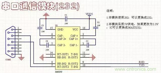 1、雙路232通信電路3線連接方式,對(duì)應(yīng)的是母頭,工作電壓5V,可以使用MAX202或MAX232.
