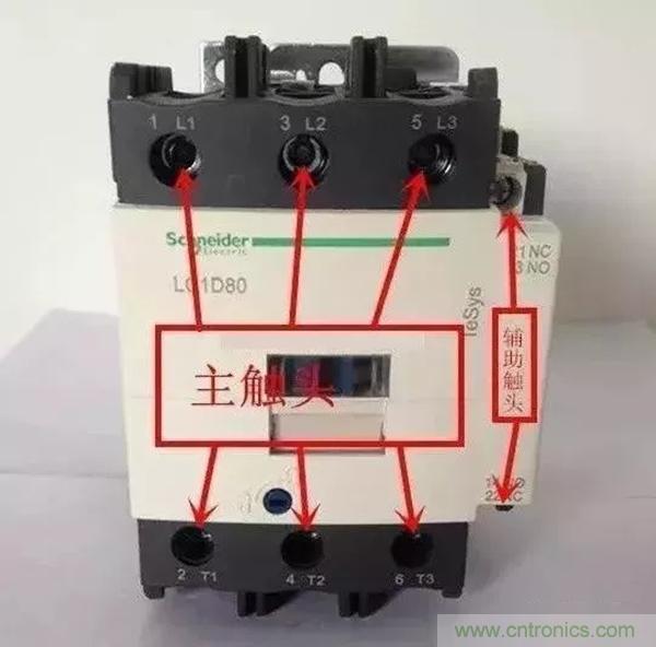 380伏交流接觸器有三個主觸頭,也就是電源進線和負載端出線,進線分別是三相火線L1、L2、L3,負載端出線分別是T1、T2、T3,接觸器主觸頭進線和出線上下一一對應,分別是L1對應T1,L2對應T2,L3對應T3,主觸頭在接觸器不吸合的狀態(tài)下是常開狀態(tài)。