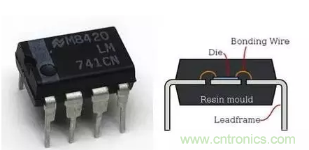 ▲ 左圖的 IC 芯片為 OP741,是常見的電壓放大器。右圖為它的剖面圖,這個(gè)封裝是以金線將芯片接到金屬接腳(Leadframe)。(Source :左圖 Wikipedia、右圖 Wikipedia)
