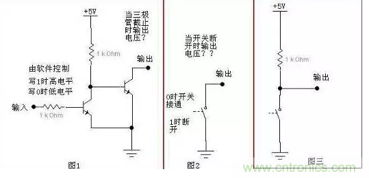 圖3中那個(gè)1k的電阻即是上拉電阻。如果開關(guān)閉合,則有電流從1k電阻及開關(guān)上流過(guò),但由于開關(guān)閉和時(shí)電阻為0(方便我們的討論,實(shí)際情況中開關(guān)電阻不為0,另外對(duì)于三極管還存在飽和壓降),所以在開關(guān)上的電壓為0,即輸出電平為0。如果開關(guān)斷開,則由于開關(guān)電阻為無(wú)窮大(同上,不考慮實(shí)際中的漏電流),所以流過(guò)的電流為0,因此在1k電阻上的壓降也為0,所以輸出端的電壓就是5v了,這樣就能輸出高電平了。