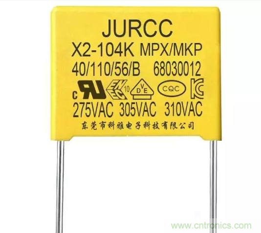 X電容是跨接在電力線兩線之間,即“L-N”之間,X電容器能夠抑制差模干擾,通常采取金屬化薄膜電容器,電容容量是uF級(jí)。X電容多數(shù)是方型,也就是類似于盒子的形狀,在它的表面一般都標(biāo)有安全認(rèn)證標(biāo)志、耐壓字樣(一般有AC300V或AC275V)、依靠標(biāo)準(zhǔn)等信息。X電容雖然是CBB電容的一種,但是并不是每一種CBB電容就能做X電容必須要達(dá)到安規(guī)標(biāo)準(zhǔn)。