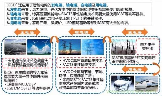 IGBT廣泛應(yīng)用于智能電網(wǎng)的發(fā)電端、輸電端、變電端及用電端: