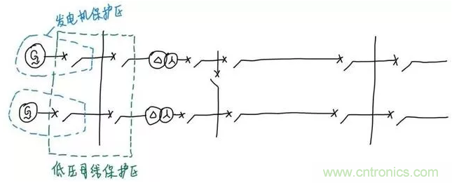我們繼續(xù)往后看??梢钥吹桨l(fā)電機(jī)接到了低壓母線,對(duì)于這個(gè)低壓母線的保護(hù)來說,要做到故障時(shí)只停母線而不停其它設(shè)備,只要讓保護(hù)在故障時(shí)切除和母線直接連接的四個(gè)斷路器就可以了。所以四個(gè)斷路器旁邊的電流互感器圍成的范圍就是這條母線保護(hù)的保護(hù)范圍。