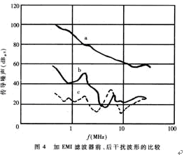 EMI濾波器能有效抑制單片開(kāi)關(guān)電源的電磁干擾。圖4中曲線a為不加EMI濾波器時(shí)開(kāi)關(guān)電源上0.15MHz~30MHz傳導(dǎo)噪聲的波形(即電磁干擾峰值包絡(luò)線)。曲線b是插入如圖3(d)所示EMI濾波器后的波形,能將電磁干擾衰減50dBμV~70dBμV。顯然,這種EMI濾波器的效果更佳。