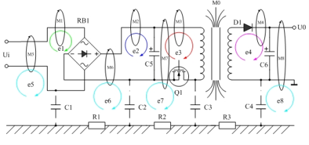 圖8是磁感應(yīng)產(chǎn)生傳導干擾的原理圖,圖8表示開關(guān)電源變壓器產(chǎn)生的漏磁通穿過其它電路時,在其它電路中也產(chǎn)生感應(yīng)電動勢,其中漏磁通M1、M2、M3產(chǎn)生的感應(yīng)電動勢e1、e2、e3屬于是差模干擾信號;M5、M6、M7、M8產(chǎn)生的感應(yīng)電動勢e5、e6、e7、e8屬于是共模干擾信號。