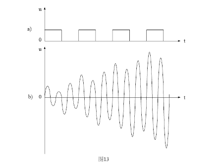 圖13是諧振回路產(chǎn)生諧振的工作原理圖。圖13-a)是一個含有諧波分量非常豐富的電壓方波,圖13-b)是LC串聯(lián)回路產(chǎn)生諧振時的電壓波形。當電壓方波作用于LC串聯(lián)回路時,方波的前后沿都會對LC串聯(lián)回路產(chǎn)生激勵(即接收能量),每次激勵過后又會產(chǎn)生阻尼振蕩(即損耗能量),當輸入電壓波形的上升率dv/dt值大于諧振回路波形(正弦波)的上升率時,電路就會產(chǎn)生激勵;當輸入電壓波形的上升率dv/dt值小于諧振回路波形的上升率時,電路就會產(chǎn)生阻尼。
