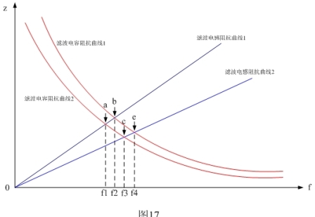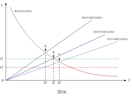 圖16表示C5電容與L0、L1、L2等電感濾波器的頻率-阻抗特性圖。圖16中紅線表示設(shè)備對(duì)地電容C5的頻率阻抗曲線;藍(lán)線是濾波電感L0、L1、L2的頻率阻抗曲線。