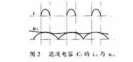若線圈電感足夠大,則電流導(dǎo)通角可達(dá)到180°,電流近似正弦波,功率因數(shù)趨于1。但是,在實(shí)際應(yīng)用中,如果電感值太大,那么其體積重量隨之變大,從而影響了電源的小型化,而且整流電壓隨著負(fù)載變化較大,因此,線圈L也不能太大。本電路中共模扼流圈L2可起到電感的作用,其等效電感為L,則可抑制電容電流的高次諧波。