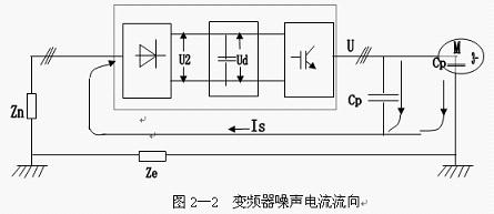 寄生電容Cp存在于電機電纜和電機內(nèi)部,因此變頻器的PWM輸出電壓波形的開關(guān)翼部通過寄生電容產(chǎn)生一個高頻脈沖電流Is,使變頻器成為一個諧波干擾源。由于諧波電流Is的產(chǎn)生源是變頻器,因此它一定要流回變頻器。圖中Ze為大地阻抗,Zn為動力電纜與地之間的阻抗。諧波電流流過此二阻抗所造成的電壓降,將影響到同一電網(wǎng)上的其它設(shè)備造成干擾。[page]