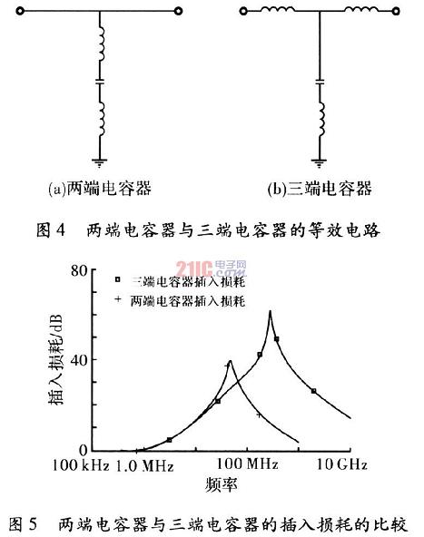 通常采用旁路電容抑制高頻噪聲。實際的電容器不僅具有電容C,還有等效串聯(lián)電阻ESR和等效串聯(lián)電感ESL。由于寄生電感的影響,對于一個實際的電容存在著自諧振頻率。在這個頻率以上時,電容呈感性。元件的寄生參數(shù)也會極大地影響濾波器的高頻特性。電容的寄生電感是主要的寄生參數(shù),而對于電感來說,寄生電容是主要的寄生參數(shù)。電容器用作旁路電容時,如圖4(a)所示,兩端電容器一端接地,另一端與信號線連接。三端電容器一端接地,其余兩端與電容器的一個電極相連并串聯(lián)到信號線上,如圖4(b)所示。一般的兩端電容器由于與其電路連接的引線電感或電極所產(chǎn)生的等效串聯(lián)電感較大,所以自諧振點較低,旁通效應(yīng)也隨之降低。采用三端電容器可有效改善此缺陷。原因在于三端電容器中流入地的電流與信號線中電流方向正交,所以其寄生電感比兩端電容降低約50%,并且其中70%以上的寄生電感轉(zhuǎn)移到信號線上。因此提高了三端電容器的自諧振頻率,也可以將它作為T形濾波器使用,更好地抑制高頻噪聲。三端電容器的地線電感起著不良作用,作為旁路電容抑制高頻噪聲時,宜采用無引線的片式陶瓷電容器。圖5為兩端電容器與三端電容器插入損耗的比較。