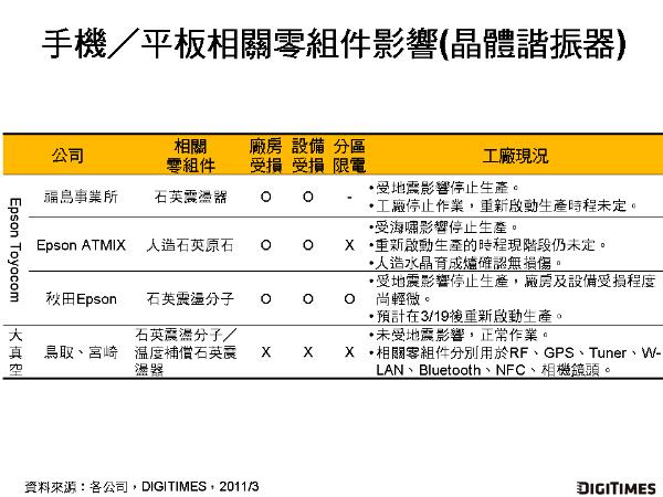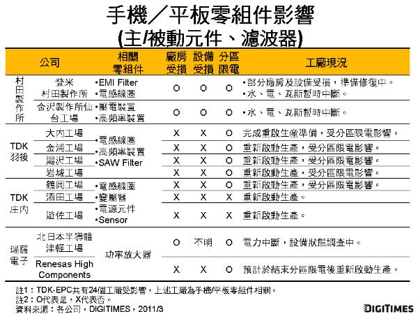 DIGITIMES Research最新報告指出,日本311強震造成日廠手機/平板相關(guān)零組件供應商分別遭受廠房、設(shè)備損壞,亦或海嘯沖擊、地方分區(qū)限電等影響,工廠作業(yè)停擺,影響超過20處工廠,在災后截至2011年3月16日仍未能正常作業(yè)。