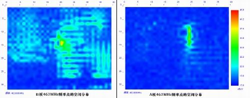 從空間圖中可以看出A板的總的電磁干擾分布區(qū)域比B板的小得多。再來看看某一個(gè)頻率點(diǎn)的電磁干擾分布情況。從圖8所示的462MHz這一個(gè)頻率點(diǎn)的電磁干擾分布情況來看,A板的幅度小,而且區(qū)域很小。B板的幅度大,而且分布區(qū)域特別廣。