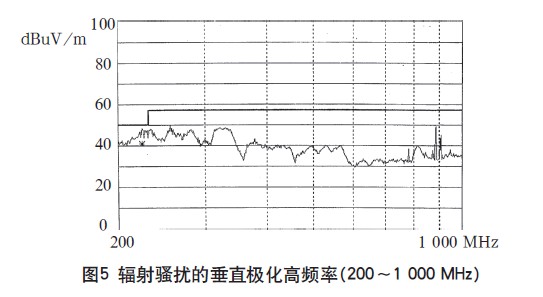 本開關(guān)電源一次通過了傳導(dǎo)騷擾的測試,測試波形如圖2、3所示。輻射騷擾高頻段230~1000MHz也測試合格,如圖5所示。只是在30~200MHz頻段范圍內(nèi)的垂直極化指標(biāo)超標(biāo),最大超標(biāo)20dB,如圖4所示。