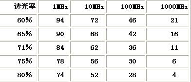 表頭或顯示器的屏蔽,可在表頭或顯示器的正面設(shè)置透光導(dǎo)電材料來實現(xiàn)。透光導(dǎo)電材料是在有機介質(zhì)或玻璃的表面覆蓋一層導(dǎo)電膜,使其既透光,又具有一定的屏蔽效能。不同透光率導(dǎo)電玻璃的屏蔽效能見表5。