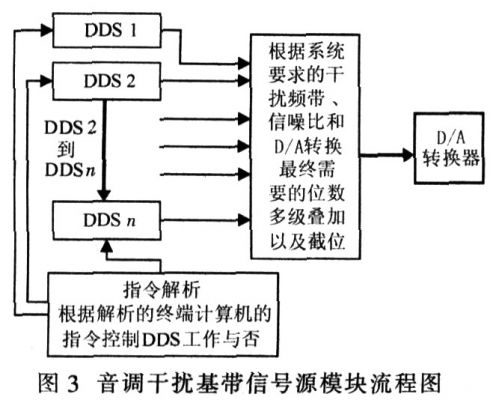 以0.02 MHz為步進(jìn)產(chǎn)生梳狀譜為例,根據(jù)系統(tǒng)選擇的基帶頻譜的范圍、信噪比依次產(chǎn)生450個以上的DDS,該DDS的時鐘頻率大于等于500 MHz,且受指令控制。當(dāng)FPGA根據(jù)終端計算機(jī)發(fā)送的指令解析為某段頻率為本方通信頻率時,關(guān)斷該段頻率對應(yīng)的所有DDS。最后FPGA將所有DDS產(chǎn)生的頻點疊加輸出到D/A轉(zhuǎn)換器,經(jīng)過D/A轉(zhuǎn)換器送入前端混頻器。該方案的優(yōu)點是:干擾各個通信頻點,而不是整個頻帶,即使有較嚴(yán)重的交調(diào),但是其在該干擾點上的輸出功率較整頻帶干擾方式還是大得多,并且功放較為容易計算所需功率。這種方式在終端計算機(jī)中需根據(jù)指令實時運算相應(yīng)干擾參數(shù),幾乎可以選擇任意可干擾和可開窗頻段,且信噪比可達(dá)很高,不受控制激勵模塊硬件資源的限制嘲。圖3為音調(diào)干擾基帶信號源模塊的流程圖。