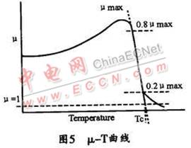 選擇電感的磁芯材料不但要考慮其磁特性,還要考慮其溫度特性,包括高低溫下的磁性變化和磁性材料的居里溫度特性。磁芯由鐵磁性(亞鐵磁性或反鐵磁性)轉(zhuǎn)變成順磁性的溫度稱為居里溫度。在圖5所示的 μ-T曲線上,80%μmax與20%μmax連線與μ=1的交叉點相對應(yīng)的溫度,即為居里溫度Tc。