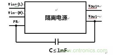 那么,如果隔離電源在應用過程中一定要進行輸出Vout-連接到PE端,可以按照上圖的連接思路,通過電容將這兩個端子進行連接,這樣設計保證了客戶特殊使用要求的同事,對于上述問題也能夠有效的規(guī)避。