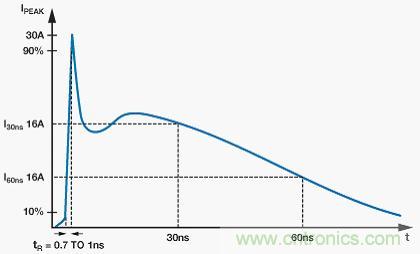 圖1顯示了規(guī)范所述的8 kV接觸放電電流波形。一些關(guān)鍵波形參數(shù)包括小于1 ns的上升時間和大約60 ns的脈沖寬度。這說明脈沖總能量約為數(shù)十mJ。
