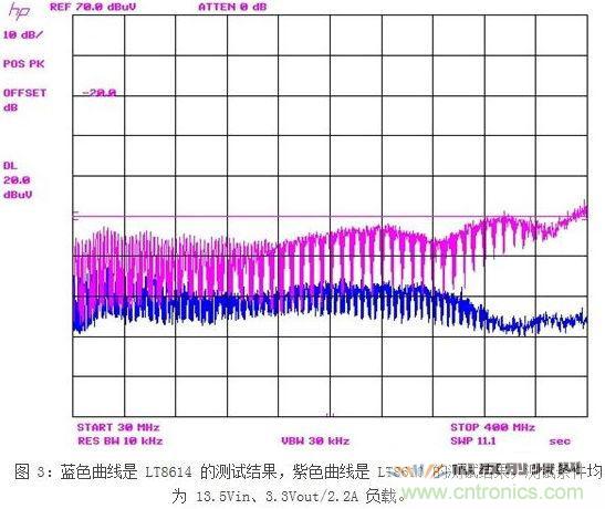 圖2所示測量結果是在電波暗室和以下條件下取得的:12Vin、3.3Vout/2A,固定開關頻率為700kHz