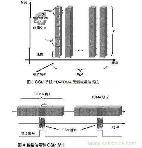 GSM(全球通)手機標準使用頻分多路傳輸和時分多路傳輸,同時傳送大量電話,如圖3所示。