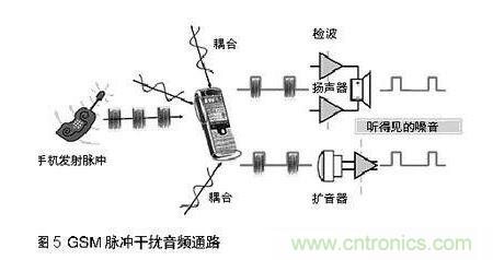 當(dāng)手機與基站通訊,或兩個手機彼此接近時,發(fā)射脈沖通過擴音器,揚聲器,或頭戴式耳機線傳入音頻通路。見圖5,結(jié)果是音頻質(zhì)量大幅降低。