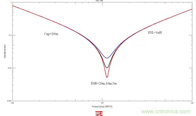 接著,我們來(lái)看看電容的并聯(lián),先暫時(shí)忽略安裝電感,后面再單獨(dú)介紹安裝電感的設(shè)計(jì)細(xì)節(jié)。同種類電容的并聯(lián)如圖3所示,諧振頻率點(diǎn)不變,但是諧振頻率處的ESR會(huì)形成電阻并聯(lián)。可以認(rèn)為同一種類電容加的數(shù)量越多,電容并聯(lián)之后,諧振頻率點(diǎn)的阻抗越低。