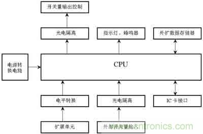 圖1為汽車行駛記錄儀硬件結(jié)構(gòu)原理。信號的抗干擾處理是通過光電隔離來實現(xiàn)。車載設(shè)備的電源系統(tǒng)對設(shè)備的可靠運行影響很大,好的電源電路能夠過濾掉許多通過電源線傳入的干擾信號。
