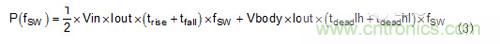 與開關(guān)頻率相關(guān)的轉(zhuǎn)換器中的兩個主要損耗是高側(cè)MOSFET和死區(qū)時間損耗的開關(guān)損耗。等式3是這些損失的基本估計,您可用它進一步分析伴隨較高開關(guān)頻率損耗增加的影響。例如,若為5V輸入、4A負載、3ns上升時間、2ns下降時間、0.7V體二極管壓降和20ns死區(qū)時間,預(yù)估功率損耗在2MHz時為325mW,在400kHz時為65mW。
