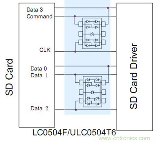 SD卡重點保護data數(shù)據(jù)線和CLK,要確保選擇的ESD器件是低容值和小封裝的產(chǎn)品:LC0504F SOT-563