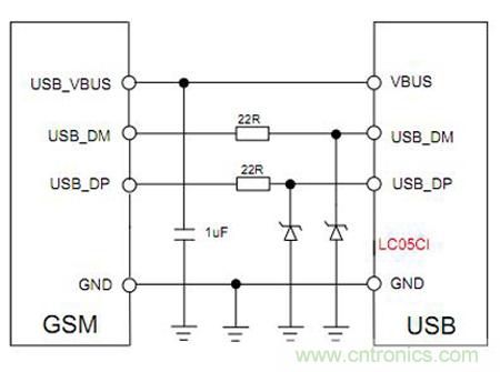 此模塊USB經(jīng)常用來配置數(shù)據(jù),插拔容易被靜電損壞,本方案可以采用分立器件或者集成器件,但要確保選擇的器件結(jié)電容小于3PF。