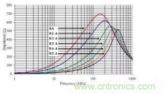 前面簡單介紹了EMI磁珠的基本特性曲線。從磁珠的阻抗曲線來看,其實(shí)它的特性就是可以用來做高頻信號(hào)濾波器。需要注意的是,通常大家看到的廠家提供的磁珠阻抗曲線,都是在無偏置電流情況下測試得到的曲線。但大部分磁珠通常被放在電源線上用來濾除電源的EMI噪聲。而在有偏置電流的情況下,磁珠的特性會(huì)發(fā)生一些變化。下面是某個(gè)0805尺寸 額定電流500mA的磁珠在不同的偏置電流下的阻抗曲線。大家可以看到,隨著電流的增加,磁珠的峰值阻抗會(huì)變小,同時(shí)阻抗峰值點(diǎn)的頻率也會(huì)變高。