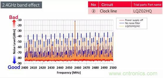 當(dāng)LQZ02HQ濾波器插入時(shí)鐘線時(shí),我們有波形和噪聲頻譜。由于LQZ02HQ濾波器具有很少的低頻衰減特性,因此它只能消除2.4 GHz頻段中存在問題的頻譜,同時(shí)保持信號質(zhì)量。因此,它是抑制諸如時(shí)鐘的信號線中的噪聲的有效方式。
