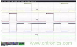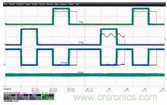 下圖3顯示的是關閉模板后示波器采集到的數(shù)據(jù)信號,每個信號的波形形狀可以被清晰的顯示和觀察。示波器基于通道2的邊沿觸發(fā),所有4個波形同時被捕獲。