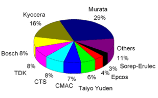 LTCC技術(shù)最早由美國開始發(fā)展,初期應(yīng)用于軍用產(chǎn)品,后來歐洲廠商將其引入車用市場,而后再由日本廠商將其應(yīng)用于資訊產(chǎn)品中。目前,LTCC材料在日本、美國等發(fā)達(dá)國家已進(jìn)入產(chǎn)業(yè)化、系列化和可進(jìn)行材料設(shè)計的階段。在全球LTCC市場占有率九大廠商之中,日商有Murata,Kyocera,TDK和Taiyo Yuden;美商有CTS,歐洲商有Bosch, CMAC,Epcos及Sorep-Erulec等。國外廠商由于投入已久,在產(chǎn)品質(zhì)量,專利技術(shù)、材料掌控及規(guī)格主導(dǎo)權(quán)等均占有領(lǐng)先優(yōu)勢。圖1給出全球LTCC廠商市場占有情況。而國內(nèi)LTCC產(chǎn)品的開發(fā)比國外發(fā)達(dá)國家至少落后五年,擁有自主知識產(chǎn)權(quán)的材料體系和器件幾乎是空白。國內(nèi)目前LTCC陶瓷材料基本有兩個來源:一是購買國外陶瓷生帶;二是LTCC生產(chǎn)廠從陶瓷材料到生帶自己開發(fā)。隨著未來LTCC制品市場中運(yùn)用LTCC制作的組件數(shù)目逐漸被LTCC模塊與基板所取代,終端產(chǎn)品產(chǎn)能過剩,價格和成本競爭日趨激烈,元器件的國產(chǎn)化必將提上議事日程,這為國內(nèi)LTCC產(chǎn)品的發(fā)展提供了良好的市場契機(jī)。中國在LTCC市場占據(jù)一定份額的是疊層式電感器和電容器生磁帶。目前,清華大學(xué)材料系、上海硅酸鹽研究所等單位正在實(shí)驗(yàn)室開發(fā)LTCC用陶瓷粉料,但還尚未到批量生產(chǎn)的程度。南玻電子公司正在用進(jìn)口粉料,開發(fā)出介電常數(shù)為9.1、18.0和37.4的三種生帶,厚度從10µm到100µm,生帶厚度系列化,為不同設(shè)計、不同工作頻率的LTCC產(chǎn)品的開發(fā)奠定了基礎(chǔ)。國內(nèi)現(xiàn)在急需開發(fā)出系列化的、擁有自主知識產(chǎn)權(quán)的LTCC 瓷粉料,并專業(yè)化生產(chǎn)LTCC用陶瓷生帶系列,為LTCC產(chǎn)業(yè)的開發(fā)奠定基礎(chǔ)。
