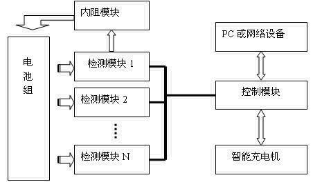 如圖3-1所示,裝置由控制模塊、檢測(cè)模塊、內(nèi)阻模塊、相關(guān)軟件和輔助部件構(gòu)成,一個(gè)控制模塊可接入多個(gè)檢測(cè)模塊,完成對(duì)不同只數(shù)和不同電壓規(guī)格的蓄電池組的監(jiān)測(cè)管理,可同時(shí)管理多組蓄電池。