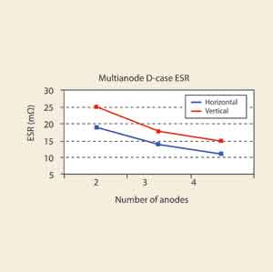橫向和縱向結(jié)構(gòu)兩者ESR性能之間的差異如圖2所示。這個(gè)例子是基于對(duì)D類(lèi)電容器的理論計(jì)算,圖2表明,兩陽(yáng)極橫向結(jié)構(gòu)與三陽(yáng)極系統(tǒng)的縱向結(jié)構(gòu)的ESR值相似。然而,相對(duì)而言橫向結(jié)構(gòu)在ESR上性?xún)r(jià)比優(yōu)勢(shì)更顯著。