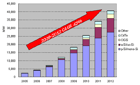 - 2009年薄膜(Thin Film) 太陽能電池的產(chǎn)能達到3.58 GW (35.8億瓦)