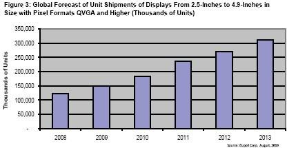 這些顯示屏可能用于高端、多功能手機,而其它很多智能手機則采用尺寸更小及其它像素格式的顯示屏和LCD。因此,其增長準確地預(yù)測了智能手機顯示屏需求的發(fā)展趨勢。