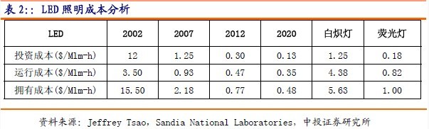 根據(jù)美國(guó)圣地亞國(guó)家實(shí)驗(yàn)室所做的LED照明成本分析,投資成本是將一個(gè)燈泡的購(gòu)買成本(每兆流明)分?jǐn)偟秸麄€(gè)壽命周期,運(yùn)行成本是指一個(gè)燈泡在運(yùn)行時(shí)的成本(每兆流明時(shí)),擁有成本是投資成本和運(yùn)行成本之和,反映了一個(gè)燈泡從購(gòu)買、運(yùn)行到壽終整個(gè)生命周期的總成本。到2010年LED的擁有成本降至0.77美元每兆流明時(shí),將低于熒光燈的1美元每兆流明時(shí),到2020年LED的擁有成本將降至0.48美元每兆流明時(shí),只有熒光燈的一半。