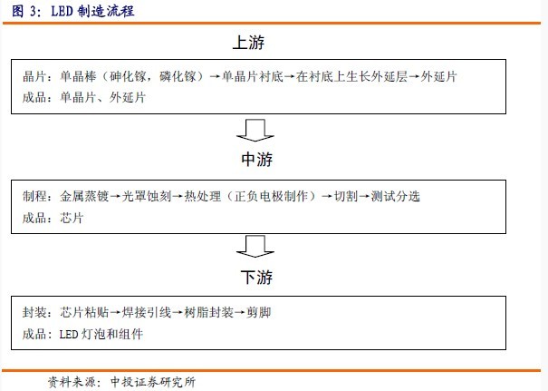 LED的制作流程包括上游的單晶片襯底制作、外延晶片生長(zhǎng),中游的芯片、電極制作、切割和測(cè)試分選,以及下游的產(chǎn)品封裝。