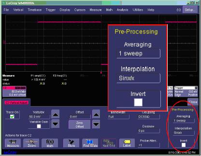 力科WaveMaster DSO體現(xiàn)了示波器用戶應(yīng)明確指定SinX內(nèi)插的原則,在默認狀態(tài)下,SinX內(nèi)插是關(guān)閉的,在指定SinX內(nèi)插時,示波器會在實際樣點之間一直內(nèi)插9個額外的樣點,而不管其它示波器設(shè)置如何,如time/div。