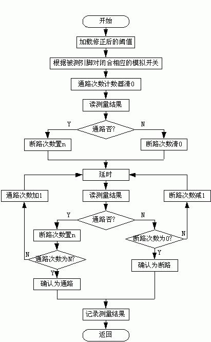 為了消除電容元件和模擬開關(guān)抖動(dòng)的影響需要延長測(cè)量時(shí)間,而要消除電感元件的影響,則要利用感生電動(dòng)勢(shì)在很短時(shí)間內(nèi)確定,為此程序中設(shè)置了兩個(gè)計(jì)數(shù)器:通路次數(shù)計(jì)數(shù)器和斷路次數(shù)計(jì)數(shù)器。設(shè)置通路次數(shù)N是為了消除模擬開關(guān)閉合瞬間由于電容充電產(chǎn)生的假通路影響,即當(dāng)累計(jì)讀得N次通路結(jié)果時(shí),一般對(duì)電容的充電已結(jié)束,才確認(rèn)被測(cè)量點(diǎn)間為通路。設(shè)置斷路次數(shù)n是為了排除模擬開關(guān)抖動(dòng)所引起的干擾,一般在連續(xù)測(cè)得n次斷路結(jié)果時(shí)表明模擬開關(guān)的抖動(dòng)已經(jīng)結(jié)束,才能確認(rèn)為斷路。但因?yàn)殡姼械母猩妱?dòng)勢(shì)在模擬開關(guān)閉合瞬間最大,隨后迅速下降,所以如果第一次和第二次測(cè)量結(jié)果都為斷路,則確認(rèn)為斷路。由于幾種情況之間互相矛盾,計(jì)數(shù)器及延時(shí)的值是在權(quán)衡三種情況的基礎(chǔ)上根據(jù)實(shí)際情況確定的。