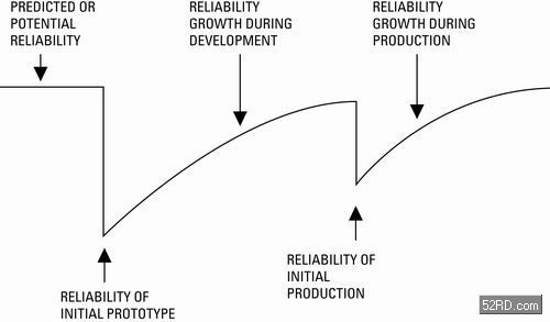 如圖4所示,每個(gè)產(chǎn)品壽命周期都包含不同階段的轉(zhuǎn)變,由原型到開發(fā),再由開發(fā)到生產(chǎn),過程中的可靠性會(huì)不斷增長(zhǎng)。換句話說,每項(xiàng)設(shè)計(jì)在其壽命周期中,可靠性都會(huì)增加,而成本則會(huì)下降。這反映了可靠性的增長(zhǎng)不單是設(shè)計(jì)工程師的責(zé)任而已。